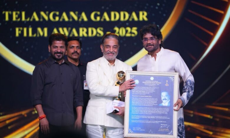 ‘தெலுங்கான கட்டர் திரைப்பட விருதுகள் 2025’ விழா ஹைதராபாத்தில் 19-03-2026 அன்று நடைபெற்றது. இந்த நிகழ்வில் தெலுங்கானா அரசின் உயரிய விருதான ‘பைடி ஜெய்ராஜ்’ விருது கமல்ஹாசனுக்கு வழங்கி கெளரவிக்கப்பட்டது.